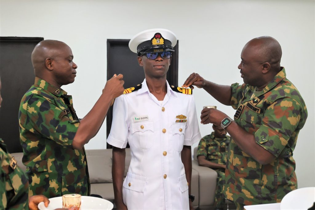 On Monday 23 June 2025, NNCAF conducted the Shipping of stripes ceremony for newly promoted officers, from Lieutenant to Lieutenant Commander at the NNCAF Tea Boat Room. In his remarks, the Commandant NNCAF, Commodore BU Quadri charges the newly promoted officers to rise to the challenges of their new rank, striving for excellence in their roles.